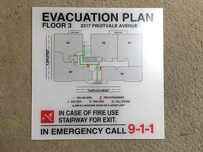 There are several fire safety signs that are required by federal law. The most common — and the one that often requires a special company to create — is the egress map, along with in-case-of fire signs, smoke signs, emergency exit signs, and “You Are Here” signs (which may be a part of the egress map). These signs may be crafted out of several materials: