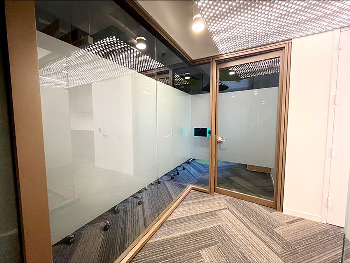 Window frosting provides privacy and branding while still allowing spaces to be well-lit with natural light.